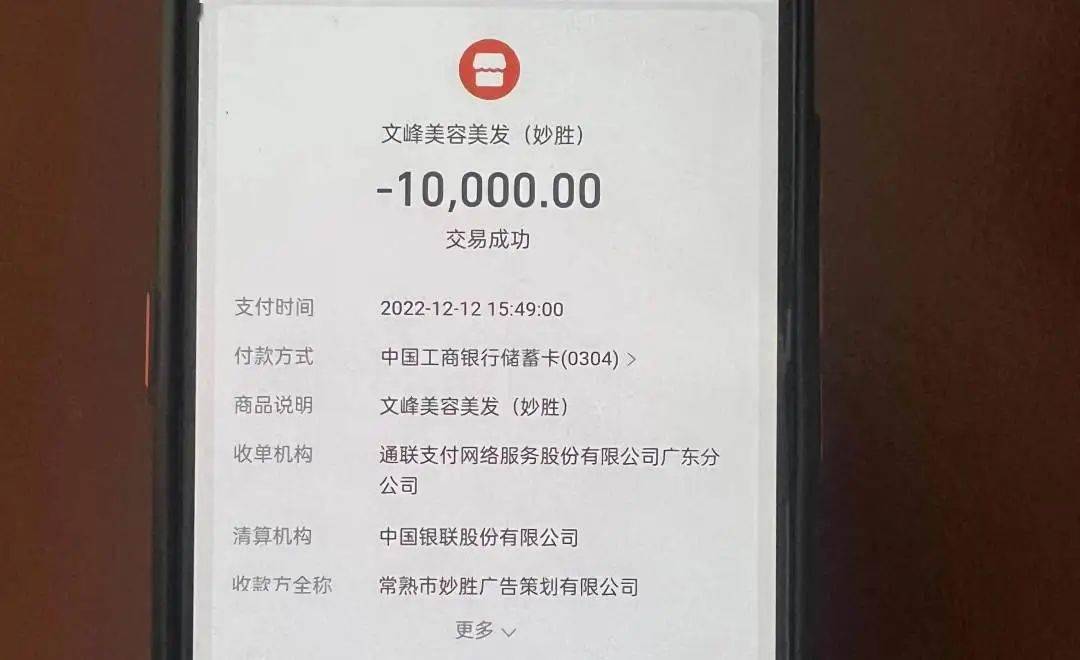 任阿姨还指出,哥哥转账的收款方显示为“常熟市妙胜广告策划有限公司”,仅在商品说明处标注“文峰美容美发(妙胜)”。明明在文峰消费,为何收款方却是外地的广告公司?这其中是不是又暗藏猫腻?