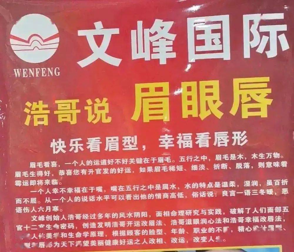 店里的过道摆放着“浩哥说眉眼”的宣传广告,写着“快乐看眉型,幸福看唇形”等字样。