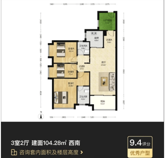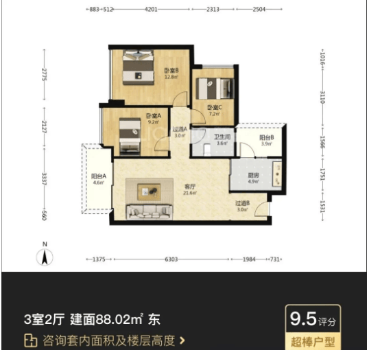 98-101㎡三房两卫户型:改善型刚需首选,南北通透,户型方正。主卧配备独立卫生间,保障私密性;客厅与餐厅相连,空间开阔,适合家庭聚会,成交价230万-258万。